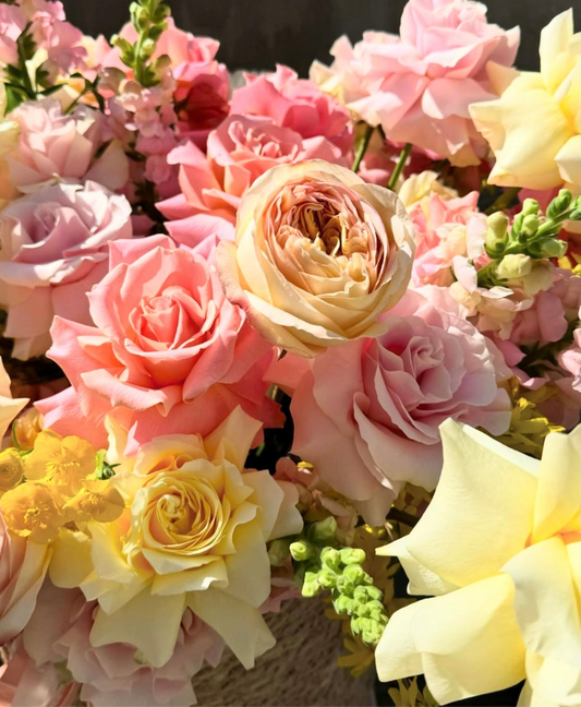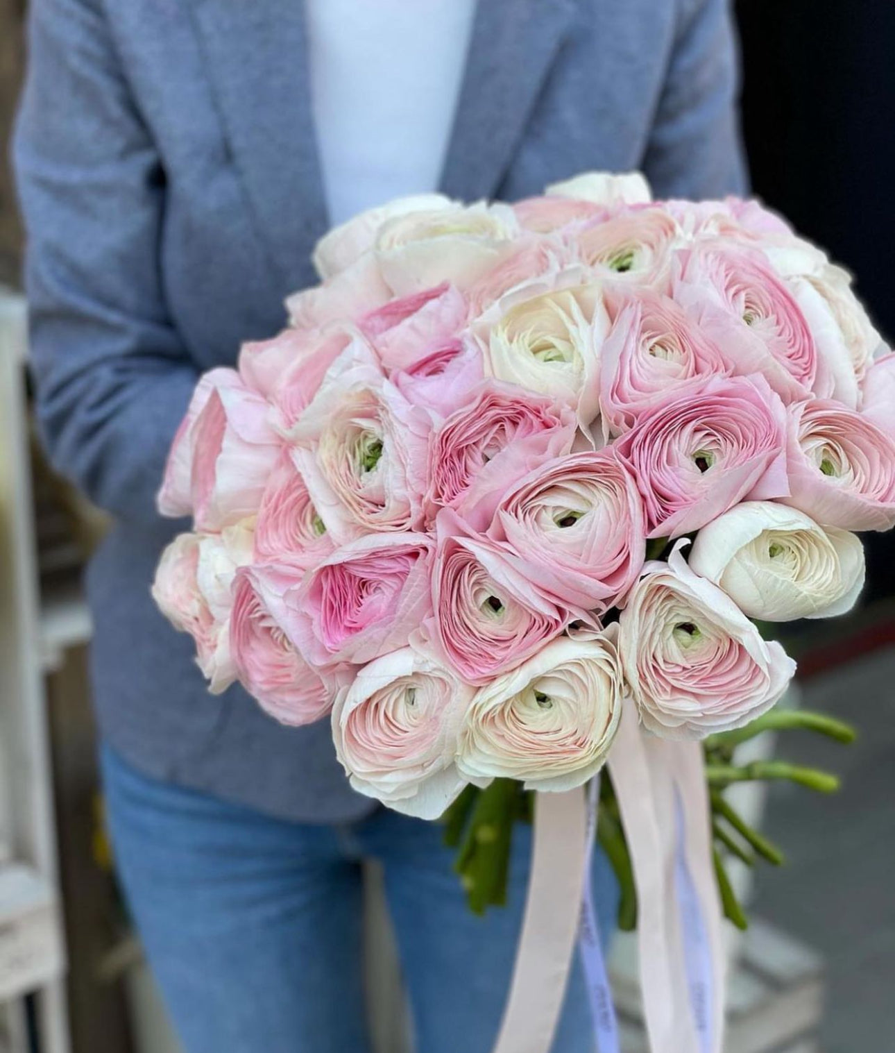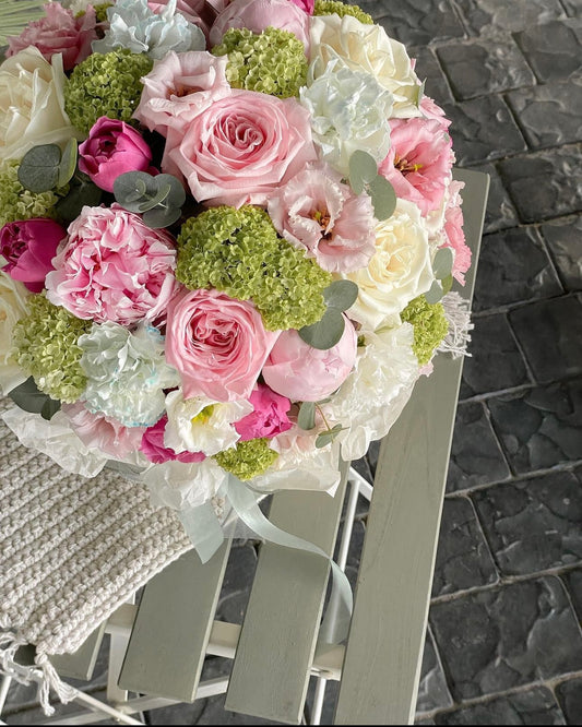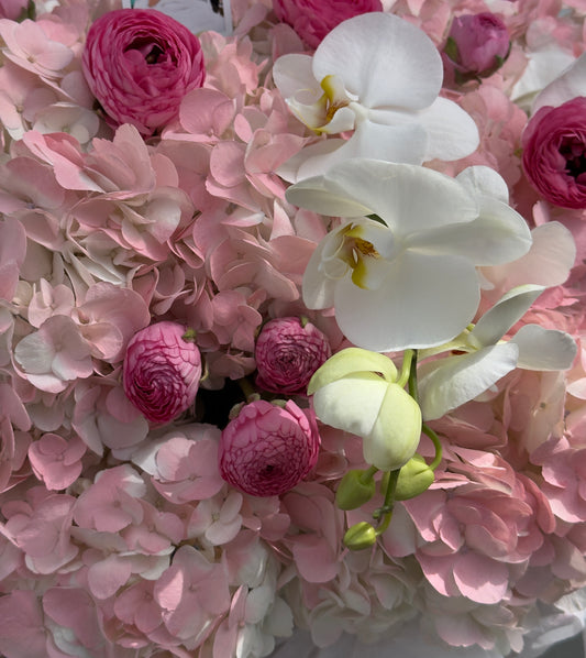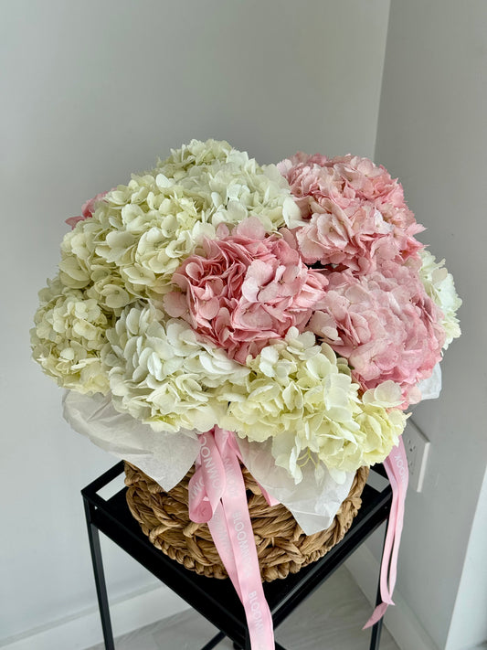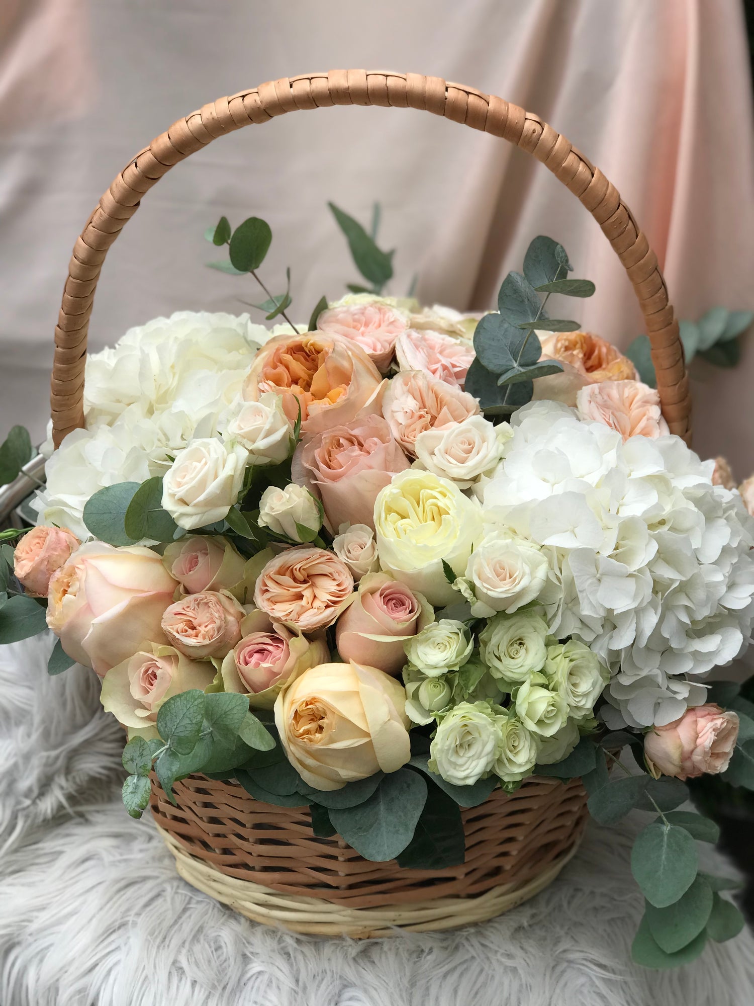 Pink mood» basket, ranunculus, hydrangeas, roses