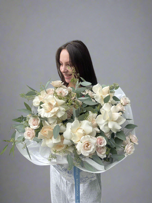 «Cream ceremony» white French roses, eucalyptus, spray roses