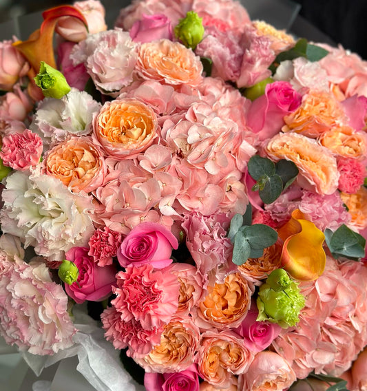 «Summer bliss» hydrangeas, roses, peony roses, carnations, calla lilies, lizianthus