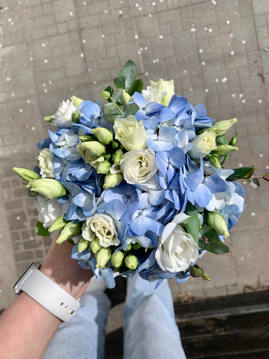 «Blue moon» wedding bouquet hydrangeas, liziantus, eucalyptus