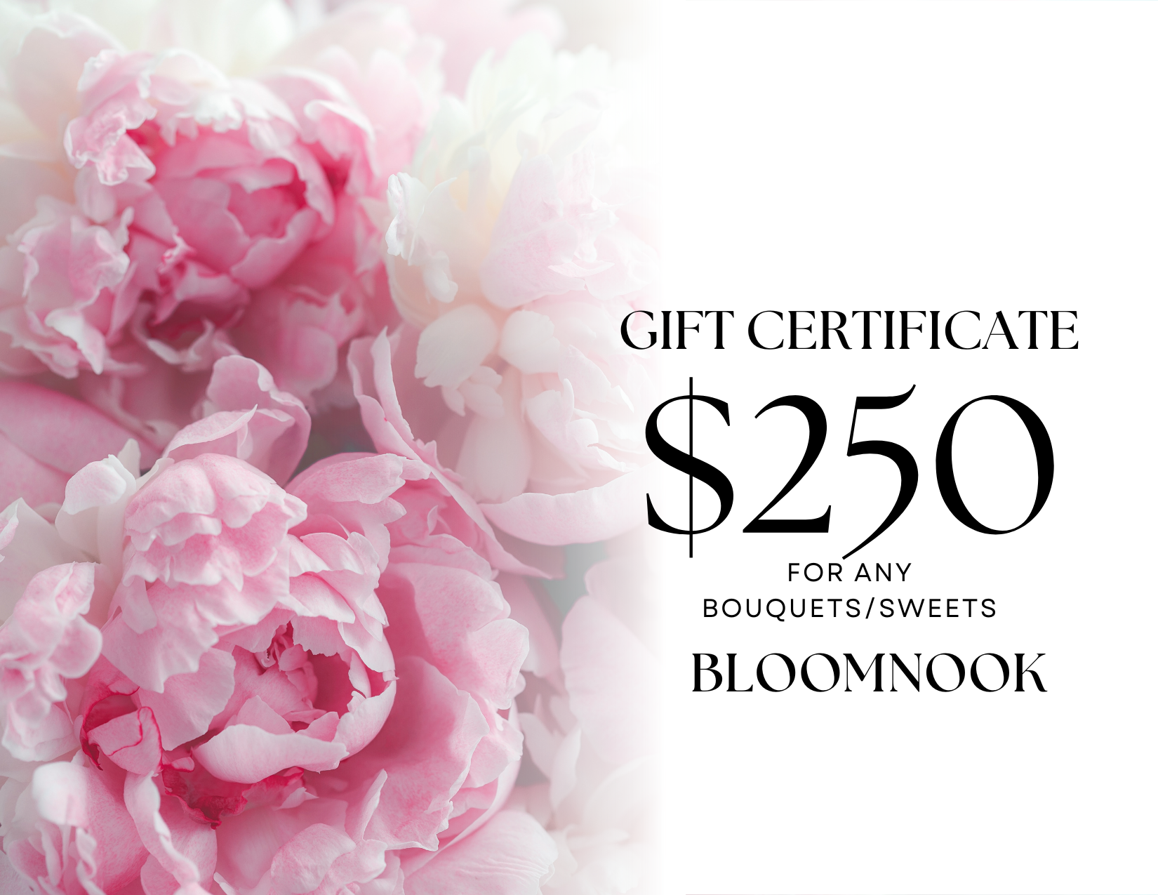 Give the gift of beautiful flowers with a BloomNook Gift Certificate. Perfect for any occasion, our certificates allow your loved ones to choose their favorite blooms, arrangements, or custom floral designs.